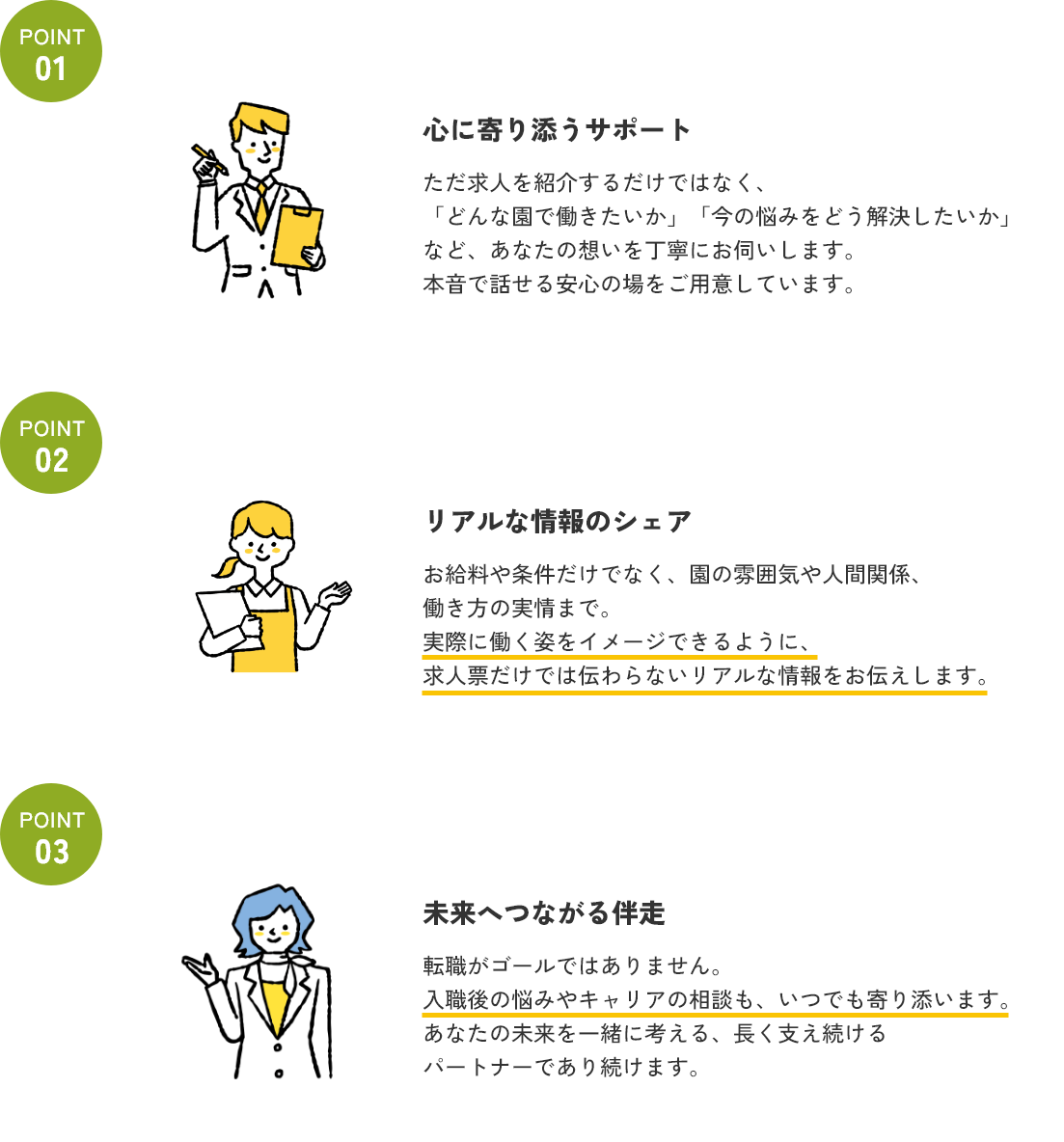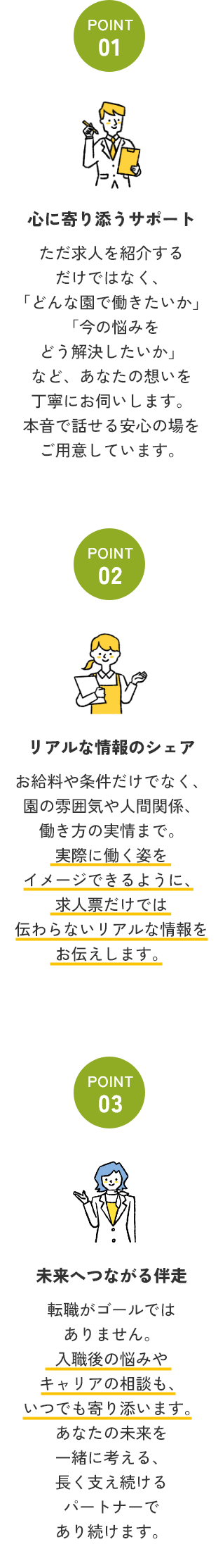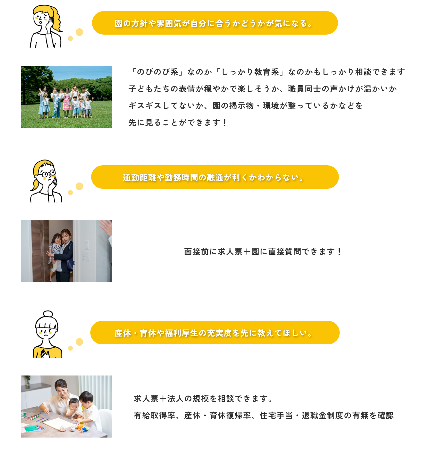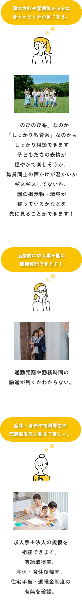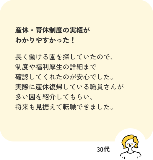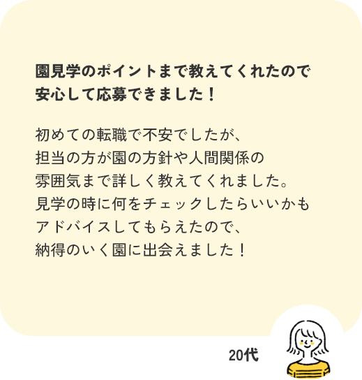 実際の園の雰囲気は求人票だけではわかりにくいですよね。 当窓口では園見学の手配や、職場の雰囲気・職員同士の関係性についてもできる限り情報をお伝えします。 見学時のチェックポイントもアドバイスいたします!